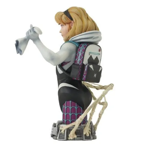 The bust showcases Ghost Spider unmasked, with her iconic mask held in one hand and a stylish backpack slung over her shoulder as she prepares for her next thrilling adventure. With web lines flying around her, this piece exudes energy and excitement. Whether you are displaying it on your shelf or gifting it to a fellow Marvel aficionado, this collectible piece will surely become a prized possession!