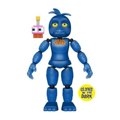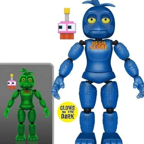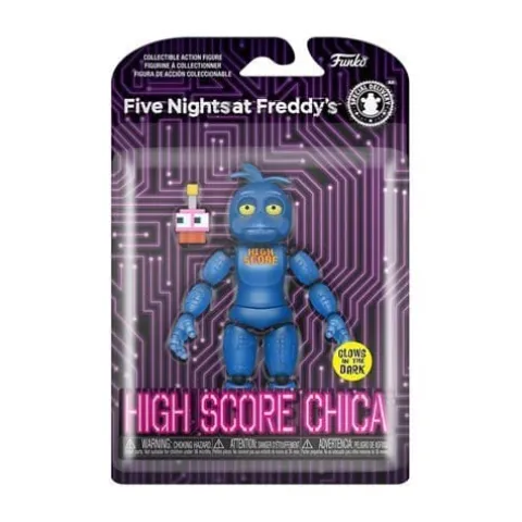 Based on Five Nights At Freddy’s VR: Help Wanted, this Five Nights at Freddy’s High Score Chica Action Figure measures approximately 5-inches tall, comes packaged in a blister card, and is Glow-in-the-Dark!