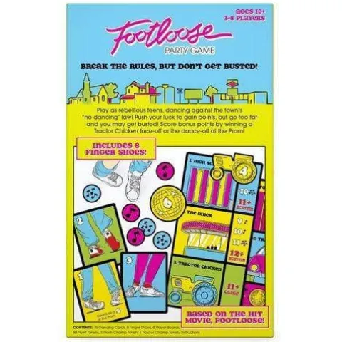 “Everybody cut footloose!” Cut loose all around town and push your luck to gain points! To win, break the rules, but down get busted. Based on the fun style of the hit 1980’s movie, the game even includes finger shoes for extra finger-dancing fun! Game includes cards, shoes, player boards, and tokens.