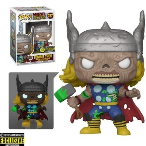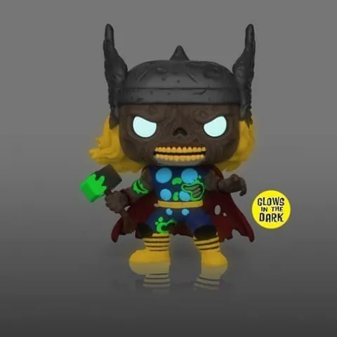 Entertainment Earth Exclusive! Geez, Thor… what happened?! The God of Thunder radiates Asgardian power and looks positively creepy as a reanimated zombie! With glow-in-the-dark deco, this just might be the most frightening Pop! to date. Measuring about 3 3/4-inches tall, the Marvel Zombies Thor Glow-in-the-Dark Funko Pop! Figure – Entertainment Earth Exclusive comes packaged in a window display box so you can place the (somewhat altered in appearance) Avenger front and center in your Marvel collection. If you collect Entertainment Earth Exclusives, you don’t want to miss this one!