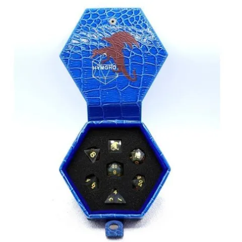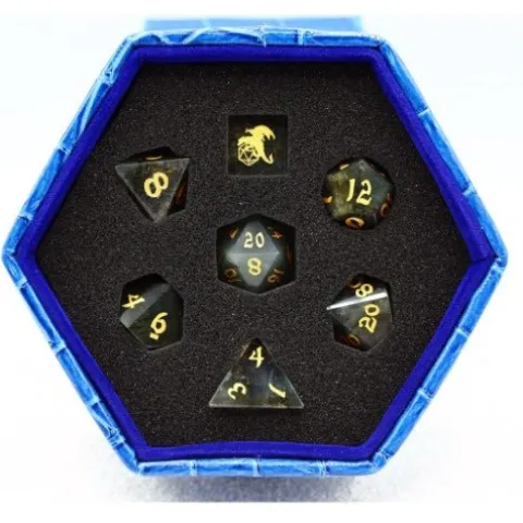 Full Set of 7 polyhedral dice in green Fluorite stone in aFine Arts Leatherette Dice Box.