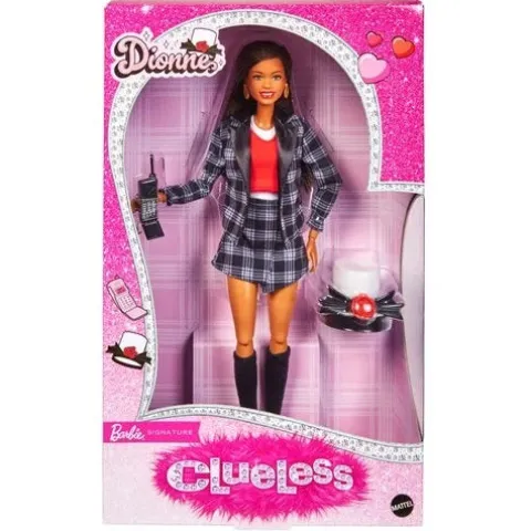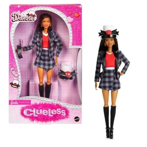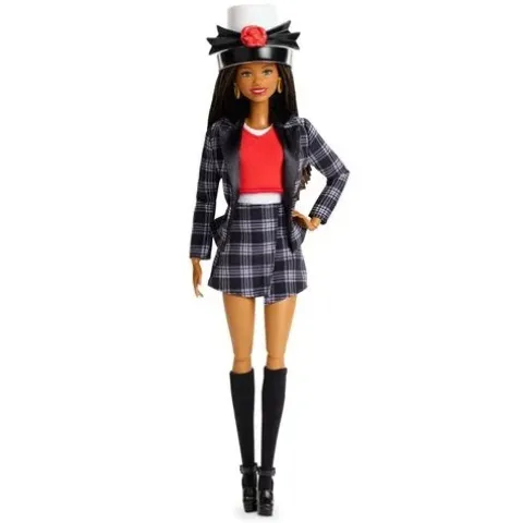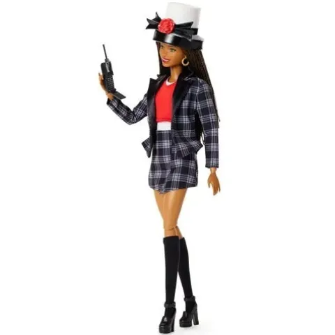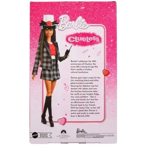 As if! This Barbie Signature Dionne collector doll celebrates the 30th anniversary ofClueless. Always the fearless fashionista, Dee gets major snaps for her iconic black-and-white plaid suit complete with her fabulous top hat donned with ribbon and rose. She has her cell phone accessory in hand and is ready to make a buzz in Beverly Hills! Doll cannot stand alone.