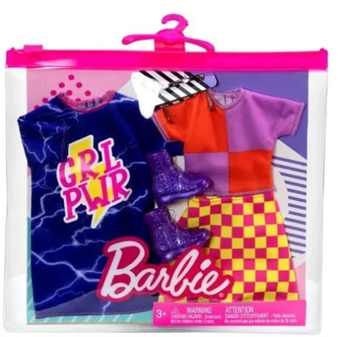 Dress Barbie doll for any challenge with a wardrobe that can keep up! With doll clothes and accessories for two complete outfits in one fashion pack, this Barbie “GRL PWR” Fashion 2-Pack offers double the styling fun (doll sold separately). This set includes a color-blocked shirt with a checkered skirt, a “GRL PWR” blue shirtshirt dress, and two accessories to help style a complete look. Mix and match within the set and with other fashions in the line to create different looks and explore style. Use the reusable vinyl package to fill, carry and customize – store Barbie fashions and accessories, take on the go and even decorate it and use for self-expression! Includes two outfits and two accessories; doll not included. Universal fit designed to fit most Barbie dolls. Ages 3 and up.
