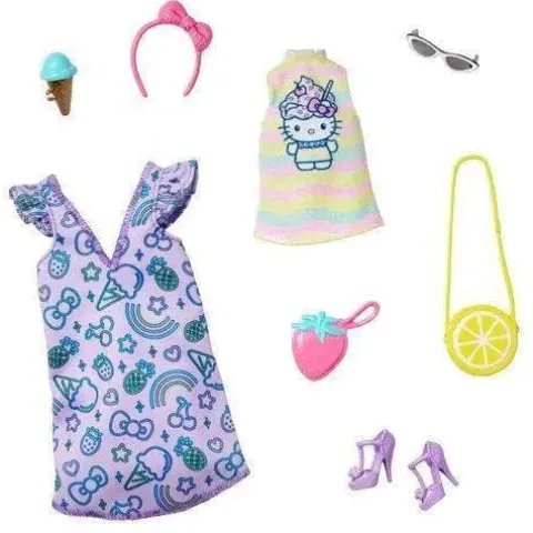 Barbie doll loves to put her own twist on the latest fashion trends (doll sold separately). And she’s captured some of her favorite influences in this cool collection — this fashion pack includes? a purple dress is designed with ruffled shoulders and a print with ice cream cones, rainbows and more; pair it with the colorfully striped top that has a Hello Kitty graphic for a sweet look! Mix and match with other clothing in the line to create different looks and explore style. With more variety in fashions, shoes and accessories, there are infinitely more ways to encourage imaginations and fun!