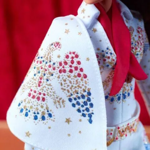 - This collectible, posable Elvis Presley Barbie doll features a slick pompadour ponytail and wears an outfit inspired by his iconic “American Eagle” jumpsuit.