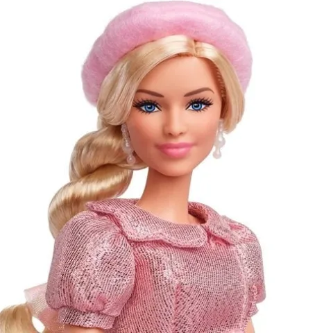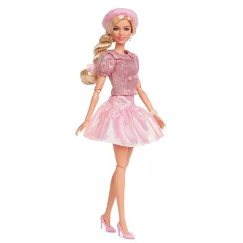Greetings from Barbie Land! Modeled after Margot Robbie inBarbie The Movie, this collectible doll wears an impeccably coordinated shimmery pink matching blouse and skirt set. Pulled straight from the film, Barbie wears this look as she leaves Barbie Land to the Real World. From her matching beret hat and hair bow to her signature pink heels, Barbie always wears her eye-catching fashions. Celebrating Barbie The Movie, this Barbie doll makes a great gift for fans and collectors alike. Doll stand included. Doll cannot stand alone. Ages 6-year-old and up