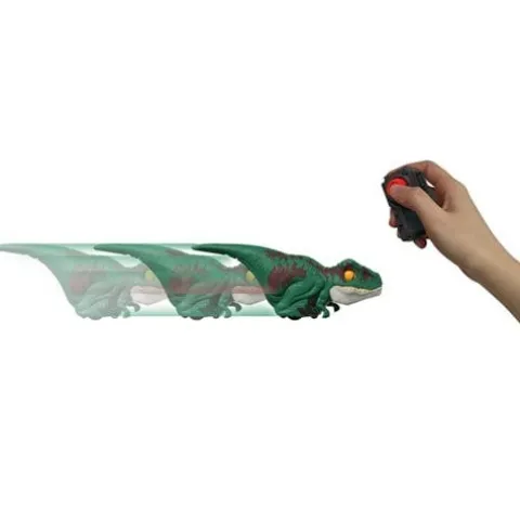 Embracing the excitement of humans interacting with dinosaurs, this approximately 6 in long green dinosaur toy has been uncaged to give kids a unique play option -becoming a DINOSAUR TRAINER, just like Owen in Jurassic World! Using the provided handheld clicker, kids make the Velociraptor move forward, spin and issue cool sounds, but watch out, this dinosaur is still wild and a little unpredictable! The clicker can control more than one dinosaur, so kids can collect them all to become the alpha of their own pack!