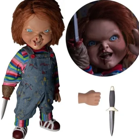A power surge at the Play Pals Corporation has breathed new life into Chucky’s reassembled remains, and here he is! The “Lakeshore Strangler” features a new head sculpt depicting a bloody-nosed, menacing expression after realizing his soul is forever trapped in the body of a doll. Depress the button discretely hidden on his back to hear Chucky speak 7 phrases, including “Alright, kid. Fun’s over.” and “Can’t keep a good guy down.” Plus, Chucky is the first MDS Mega-Scale figure to have an interchangeable appendage. His right hand can hold his butcher knife accessory or it can be swapped out for his infamous knife hand! Sporting his signature “Good Guy” overalls and stripped shirt, Chucky features 11 points of articulation, his trademark orange hair, and realistic glass-like eyes. The Child’s Play Menacing Chucky Talking Mega-Scale 15-Inch Doll comes packaged in a collector-friendly, film-inspired window box. Order him if you dare! Ages 17 an up