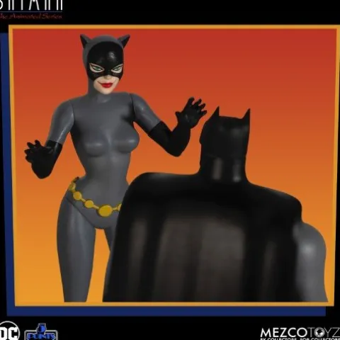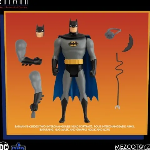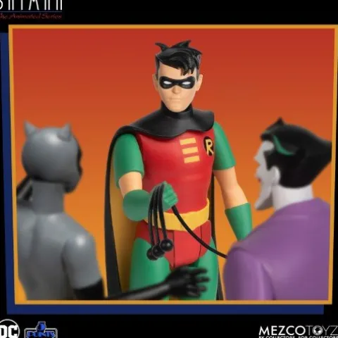From Mezco Toys.Inspired by the 90s animated series,5 PointsBatman: The Animated Seriescontains everyone’s favorite crime-fighting duo and a variety of Gotham City’s most notorious villains, each complete with their own interchangeable heads, arms, and accessories. Each figure is individually packaged in a retro style blister card, perfect for display! CollectBatman: the legendary crime-fighting hero of Gotham, equipped with cutting-edge tech and honed to peak human ability to combat evil;Robin: the Boy Wonder, trained by Batman himself, ventures into the night with his caped mentor as Gotham’s greatest crime fighters, known as the Dynamic Duo;The Joker: the eccentric Clown Prince of Crime and one of Batman’s deadliest arch-enemies, weaving his sinister jokes and pranks into heinous crimes in his attempts to take over Gotham City; andCatwoman: A purr-fectly skilled criminal, thief, and the ultimate nemesis of Batman & Robin.