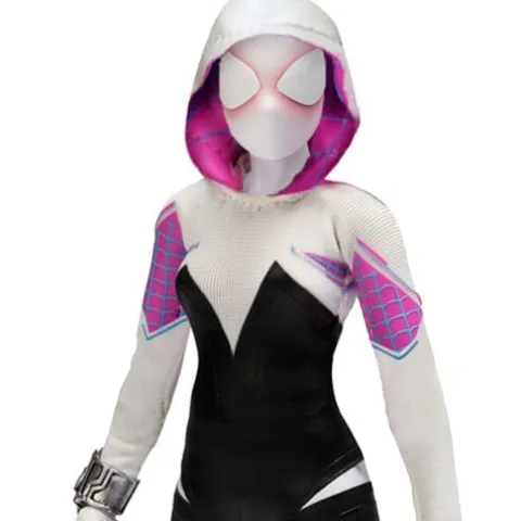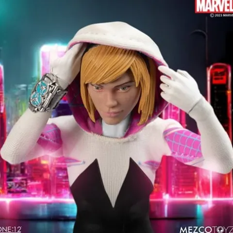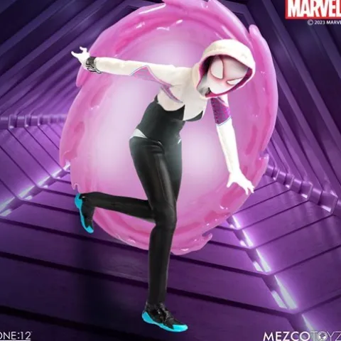 The One:12 Collective Ghost-Spider wears a fitted, hooded body suit with cobweb detailing. She comes complete with four head portraits with varying expressions, including an unmasked Gwen Stacy portrait.Ghost-Spider is equipped with all she needs to travel the multiverse such as a dimensional travel watch, multiple web lines, a cell phone, a multiverse portal FX, and more. For ages 18 and up.