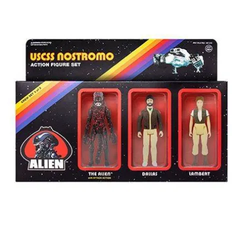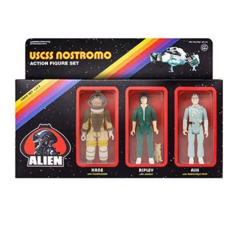 The original Alien is back! Based on an unproduced Kenner design from 1979, the Alien 3 3/4-inch ReAction Figures Pack A features a window display packaging and includes a Kane with facehugger, Ripley with Jonesy, and Ash with removable head.