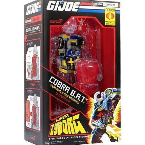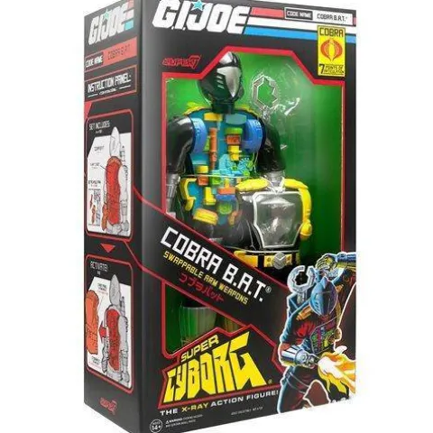 An official Super7 x G.I. Joe collaboration. The 11-inch G.I. Joe Cobra B.A.T. Super Cyborg Vinyl Figure features poseable arms and legs, plus swappable arm attachments just like the old days! Doctor Mindbender’s creation, the Cobra Battle Android Trooper (B.A.T.) as you’ve never seen it before! Along with seven points of articulation, the Super Cyborg Cobra B.A.T. action figure stands 11-inches tall and features a clear exterior so you can see ALL of the inner workings. Your figure will come with a gripper claw, laser cannon, and flamethrower accessories, and will be a fearsome addition to your G.I. Joe collection!