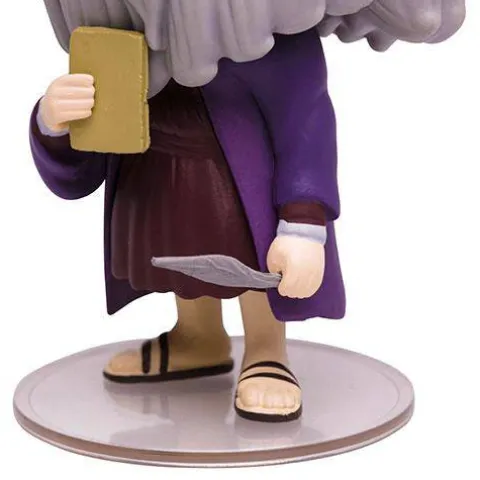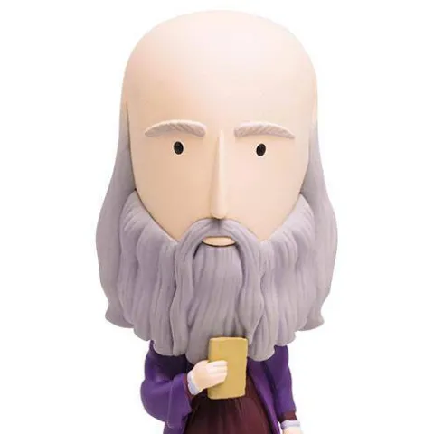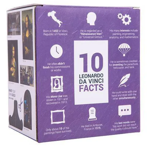 The Leonardo da Vinci action figure comes with: Glow-in-the-dark hair, beard, and eyebrows. Fun accessories: book and quill. Removable hat. 5 masterpieces and 1 cardboard easel. 10 fun facts about the artist on the box. Transparent base. The action figure is 5 inches tall and made of PVC. warning: choking hazard. Small parts. This is not a toy. it is not designed nor intended for children under the age of 12.