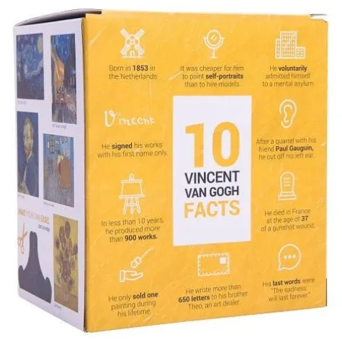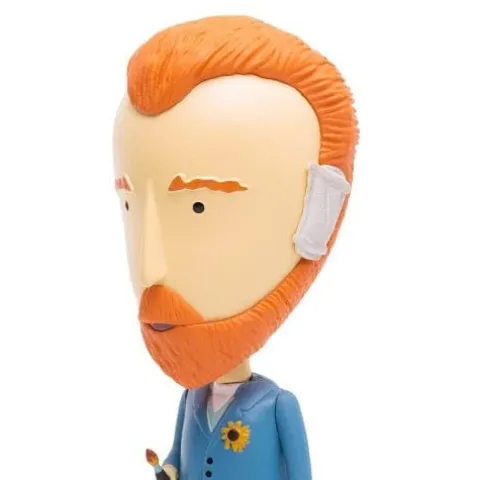 The Vincent van Gogh action figure comes with: 2 removable ears (Van Gogh cut his left ear). 1 bandaged ear. 1 paintbrush. 5 masterpieces and 1 cardboard easel 10 fun facts about the artist on the box. Transparent base. The action figure is 5 inches tall and made of PVC. Warning: choking hazard. Small parts. This is not a toy. it is not designed nor intended for children under the age of 12.
